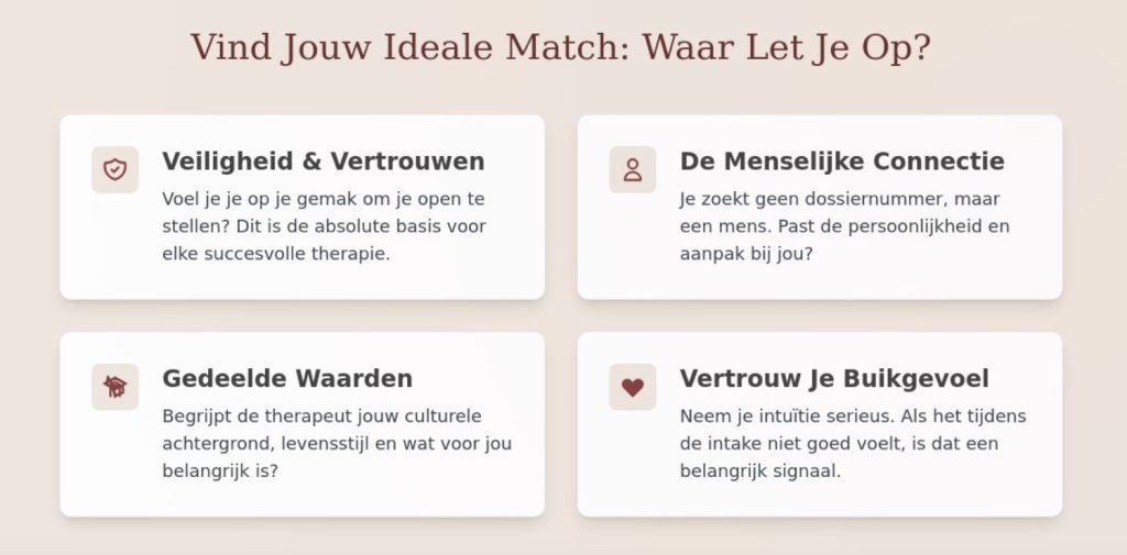 Een goede match ontstaat wanneer er ruimte is voor culturele sensitiviteit en gedeelde waarden. Je wilt niet constant hoeven uit te leggen waarom bepaalde zaken in jouw leven belangrijk zijn. De balans tussen professionele afstand en menselijke nabijheid is hierbij essentieel. Je therapeut moet een spiegel kunnen voorhouden zonder dat het koud of klinisch aanvoelt. Vertrouw tijdens een intakegesprek altijd op je buikgevoel. Als je na tien minuten merkt dat je je inhoudt of je niet op je gemak voelt, is dat een belangrijk signaal om serieus te nemen.